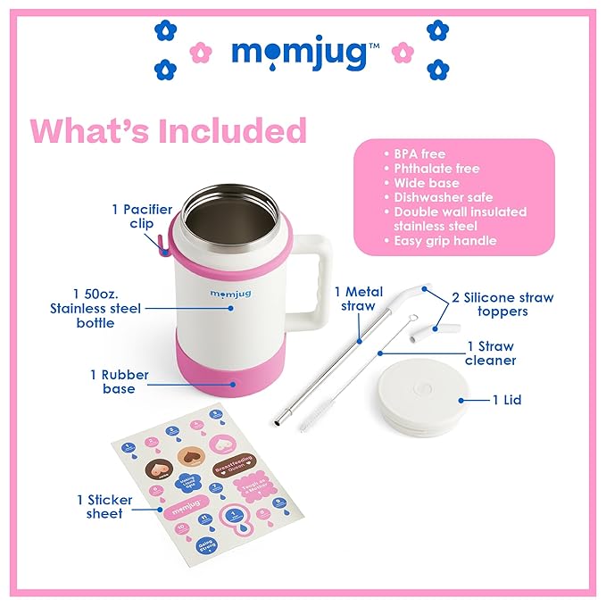 - The momjug water bottle with leak proof straw offers innovative features including a breast indicator to track breastfeeding sessions, a pacifier clip, and a tip-proof wide silicone base. Additional features include a metal straw with flexible silicone tip, straw cleaner, and ergonomic handle.