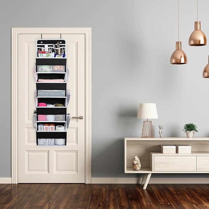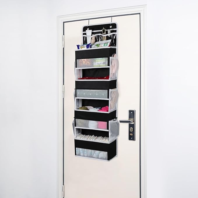 Univivi Over the Door Organizer, Door Hanging Organizer Nursery Door Storage with 4 Large Compartments and 2 Small PVC Pockets 6 Side Pockets for Bathroom,Cosmetics and Nursery Baby Essential - Black