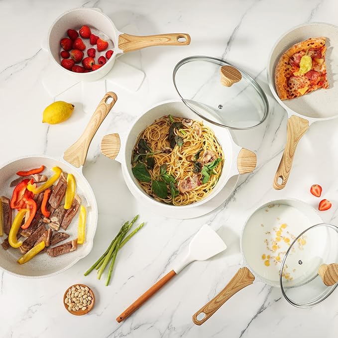 - SUITABLE FOR A LARGE FAMILY - This beige white nonstick ceramic cooking set includes everything your kitchen needs: a 9.5" frypan and a 12.5" frying pan, an 11" / 4.5qt sauté pan with lid, a 1.5qt saucepan and a 2.5qt saucepan with lid, a 4.7qt casserole with lid, 2 silicone utensils, and 5 reusable pot protectors.