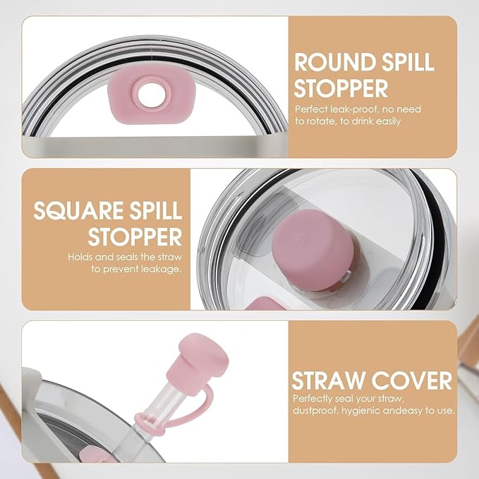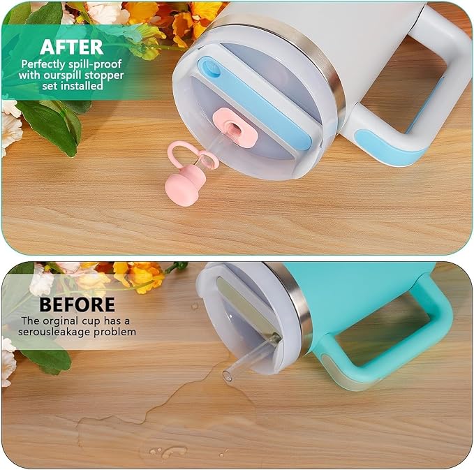 - Silicone Spill Proof Stopper Set: Compatible with Stanley Cup 2.0 40oz/30oz and other tumblers, this spill-proof stopper set offers versatile protection against leaks and spills. Made from high-quality silicone, these stoppers provide a secure seal, keeping your drinks safe and your cup clean.