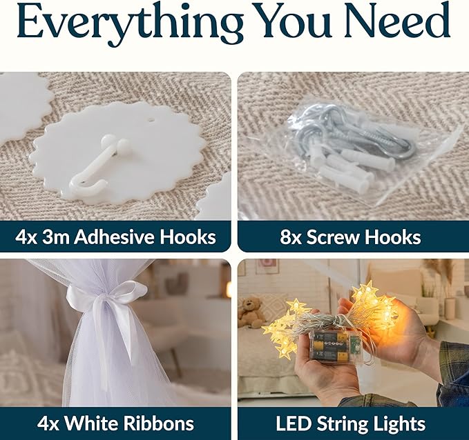 Canopy Bed Curtains with Lights, White Bed Canopy For Girls & Adults | Fits Full, Double, Queen, King | Bed Curtains From Ceiling Or Bed Frame, Bed Curtains, Bed Canopies & Drapes, Princess Bed
