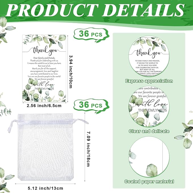 - Bulk Wedding Souvenirs for Guests: this set provides 36 wine corks, 36 bottle openers, 36 thank you cards, and 36 organza bags; This generous quantity and ideal mix are well suited for your daily usage and party gifting requirements