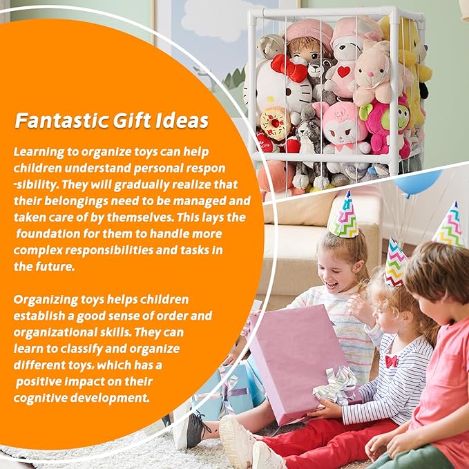 - Durable Construction: Crafted from thickened PVC plastic, the sturdy frame of our Stuffed Animal Zoo Storage ensures long-lasting durability. Each part is tightly connected using precisely molded PVC pipe connectors, eliminating concerns about popping out between connections. Additionally, anti-tipping devices and anti-scratch plastic feet are included for enhanced security and floor protection.