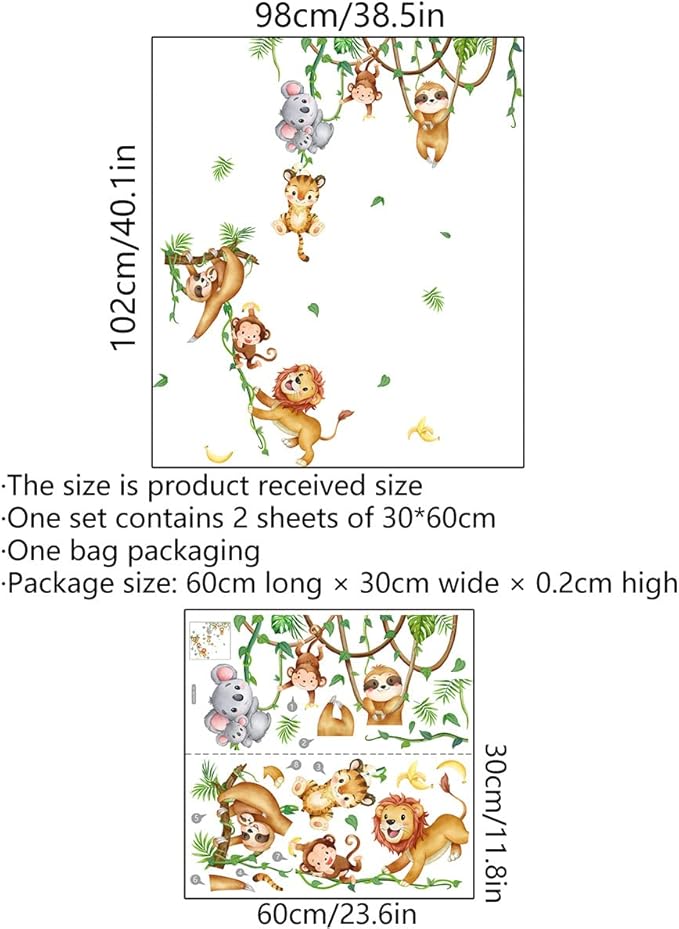 - 【Stylish Pattern】Jungle animals wall decals, lion monkey sloth koala tiger print art and modern design into an eye-catching mural. This sticker is very suitable for nursery, bedroom, playroom, living room, adorable kids room decor.