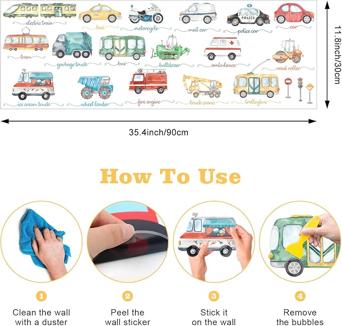 - [Easy to Peel and Stick Kids] This set of transports wall decals peel and stick is suitable for all smooth surfaces, including walls, furniture, windows, doors, mirrors, or anywhere you can imagine that can be decorated.