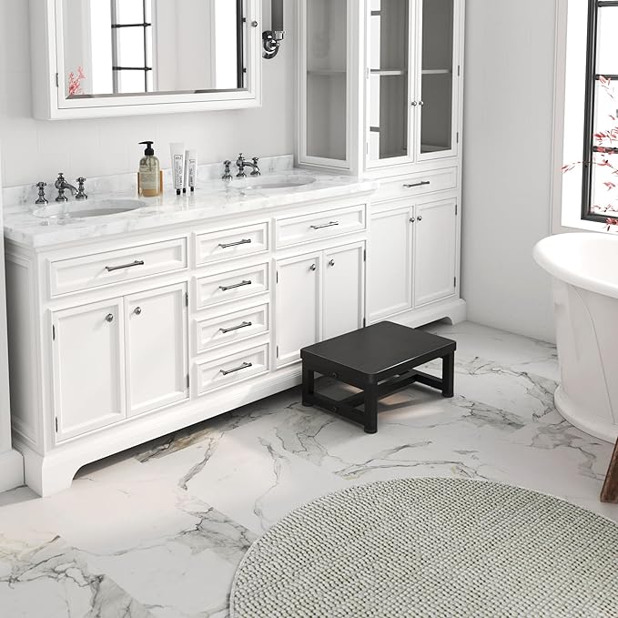 - 【Multi-functional & Multi-location】Step foot stool is great for kitchen, bathroom, bedroom, balcony, office, dining room, garden, porch, garage, or outdoor camping, fishing, etc. Metal step stool can be used as toddler step stool, kitchen step stool, bathroom step stool, bed step stool, closet step, or as a temporary seat for outdoor activities. Wood stool is widely used and can be used for many places