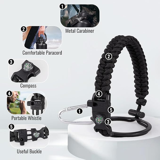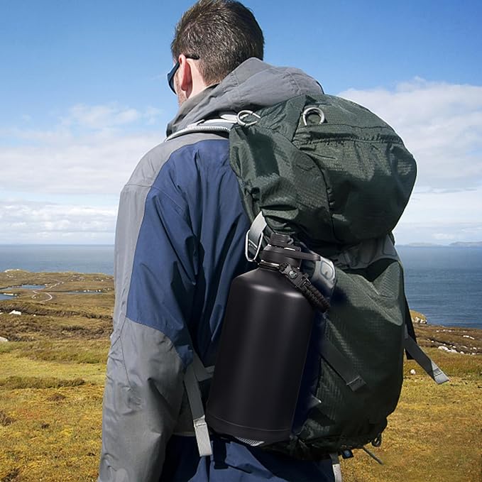 - Versatile Paracord Handle: Hand-woven with durable nylon paracord, the stylish handle of our water bottle not only matches its color but also includes a compass and carabiner. Paracord can make lifting a 64oz/128oz water jug easier for you, making it the perfect companion for all your outdoor adventures.
