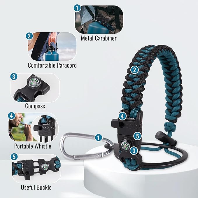 - Versatile Paracord Handle: Hand-woven with durable nylon paracord, the stylish handle of our water bottle not only matches its color but also includes a compass and carabiner. Paracord can make lifting a 64oz/128oz water jug easier for you, making it the perfect companion for all your outdoor adventures.