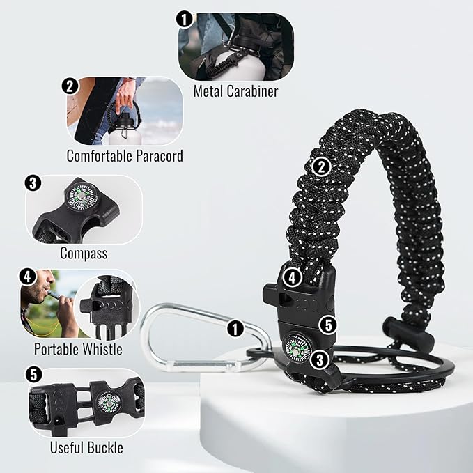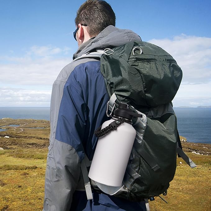 - Versatile Paracord Handle: Hand-woven with durable nylon paracord, the stylish handle of our water bottle not only matches its color but also includes a compass and carabiner. Paracord can make lifting a 64oz/128oz water jug easier for you, making it the perfect companion for all your outdoor adventures.
