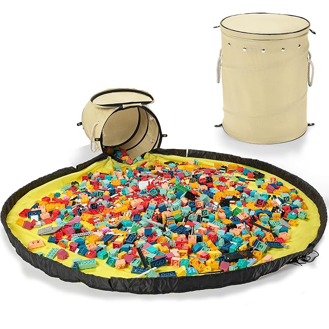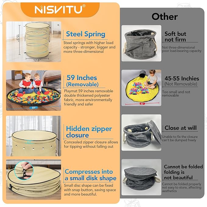 - Plenty of Space:Our kids toy organizer measures 15.5 inches tall and 12.6 inches in diameter, comes with a roomy 59-inch diameter play mat, has fenced edges to prevent toys from scattering, and can hold up to 11 gallons of toys. When the foldable storage box is not in use, the entire storage basket can be compressed into a small round cake that can be fixed with snap buttons. It is small and easy to store,hidden zipper is more beautiful.