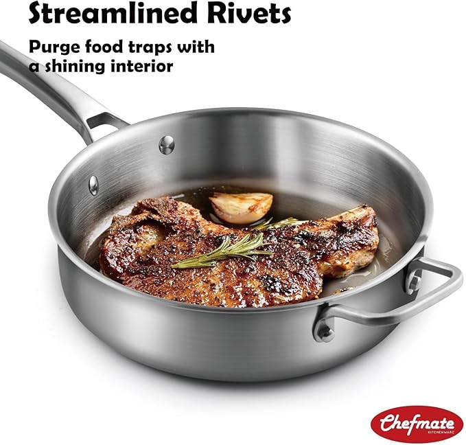 - 【TRI-PLY STAINLESS STEEL】Chefmate Tri-Ply Stainless Steel Pan Combines Ergonomic kitchenware Design and superior features for better cooking performance. Stainless steel surface doesn't react with food or alter flavors.