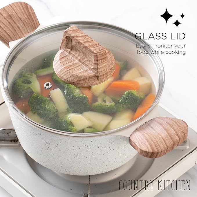- SET INCLUDES - A complete kitchen essentials set, you're getting a total of 10 cookware pieces and 4 silicone utensils. Including an 3 qt casserole pot with glass lid, a 4 qt casserole pot with glass lid, a steamer, an 11” frying pan, an 8” frying pan, a 11" deep frying pan with glass lid, and a 2 qt sauce pan with glass lid. These beautiful cookware sets are designed with a speckled coating and woodlike handle. Not only functional, but these sauté pans are decorative as well.