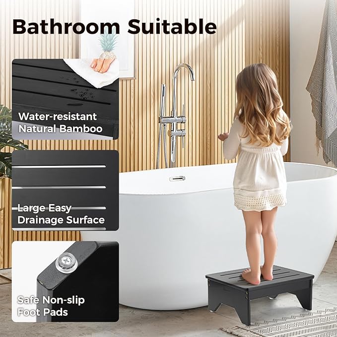 StrongTek Bamboo Step Stool for Adults, Bedside Step for High Beds, 300 Lbs Capacity, Non-Slip Bed Foot Stool with Rounded Edges, Small One Step Stool for Bathroom, Bedroom, Garden, Kitchen (Black)