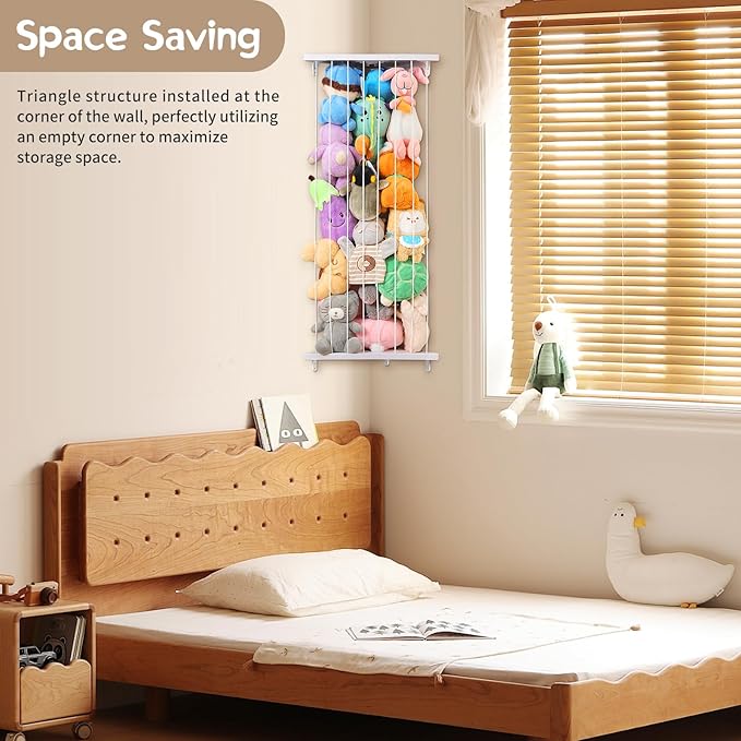 - Space Saving: Designed for use on corner wall, this stuffed animal holder will not take up extra floor space. Fan-Shaped cutting, can make full use of the corner position, which will save a lot space for you. Great hanging toy organizer for kids playroom bedroom.