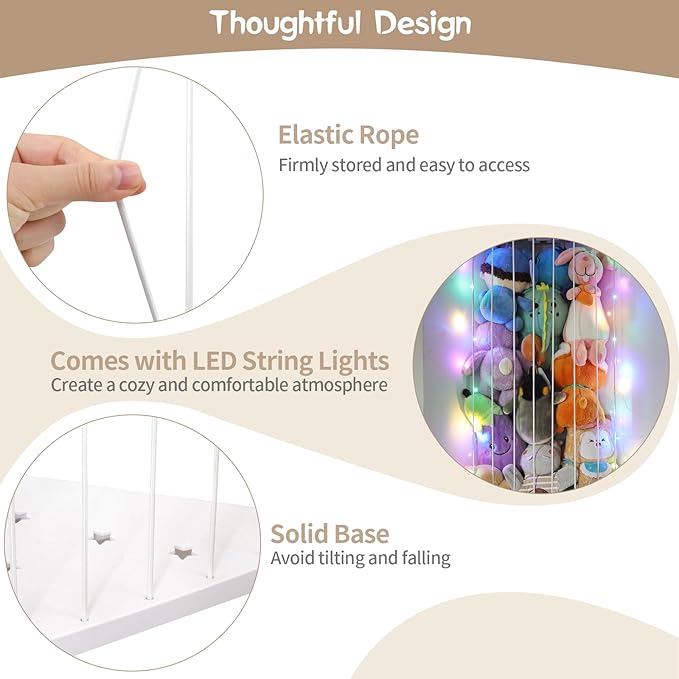 - Practical & Decorative: This stuffed animal wall holder comes with LED string lights(9.7 inches,50cm, requires 3 batteries - not included), which is great for display and store cuddly plush toys. Light can create a cozy and comfortable atmosphere, kids will be more relaxed.