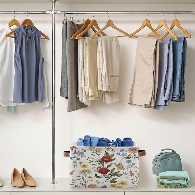 Vintage Wildflower Floral Storage Basket Bin for Shelves Closet Butterfly Rose Foldable Fabric Storage Box Cube with Handles Kids Gift Toy Shelf Basket Organizer for Bedroom Nursery Home Decor