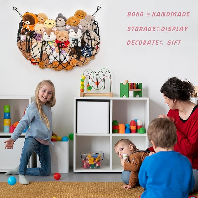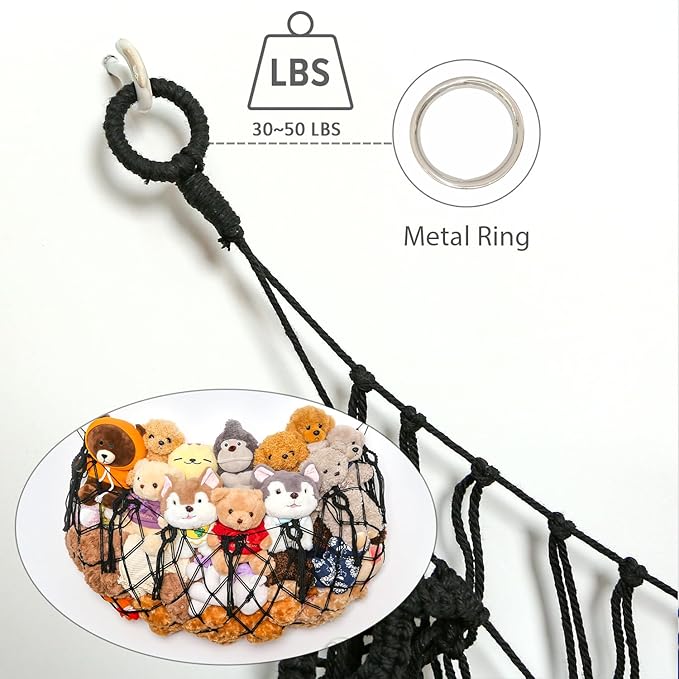 - 【Eco-Material,Handmade Gift with Love】The stuffed animal hammock is made of high quality macrame cotton cord, and was woven with love by our mom team artists. The macrame toy hammock will not loosen with time and change its shape. Our macrame stuffed animals display is environmentally friendly, safe and durable.At the same time, our macrame stuffed animal hammock add safety steel rings design to prevent stuffed animal net or hammock from falling and ensure you kids safety.