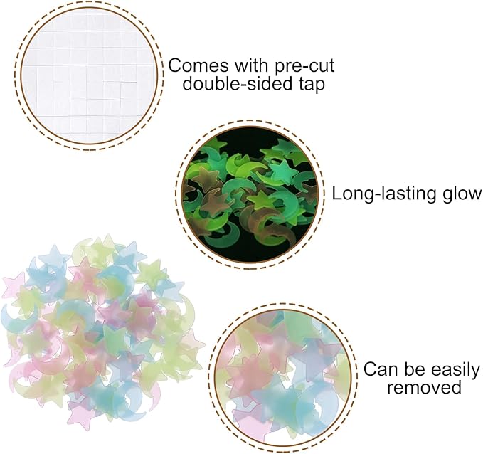 - Design: The stickers have a long-lasting glow and can be recharged by exposing them to a light source again, allowing them to remain glowing for a long time without losing brightness. They can be easily removed without damaging the surface, giving you the flexibility to replace them as needed.