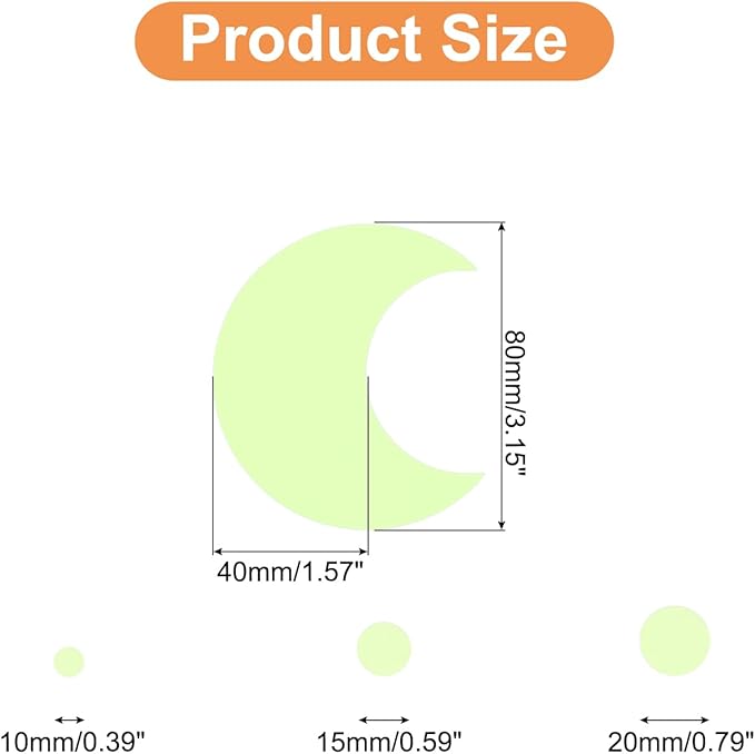 - [What You Get] - Moon Sticker Size: 80 x 40mm/3.15" x 1.57"(L*W); Dot Sticker Size: 20mm/15mm/10mm(0.79"/0.59"/0.39"); Package Content: 1 Set x Glow in The Dark Stickers