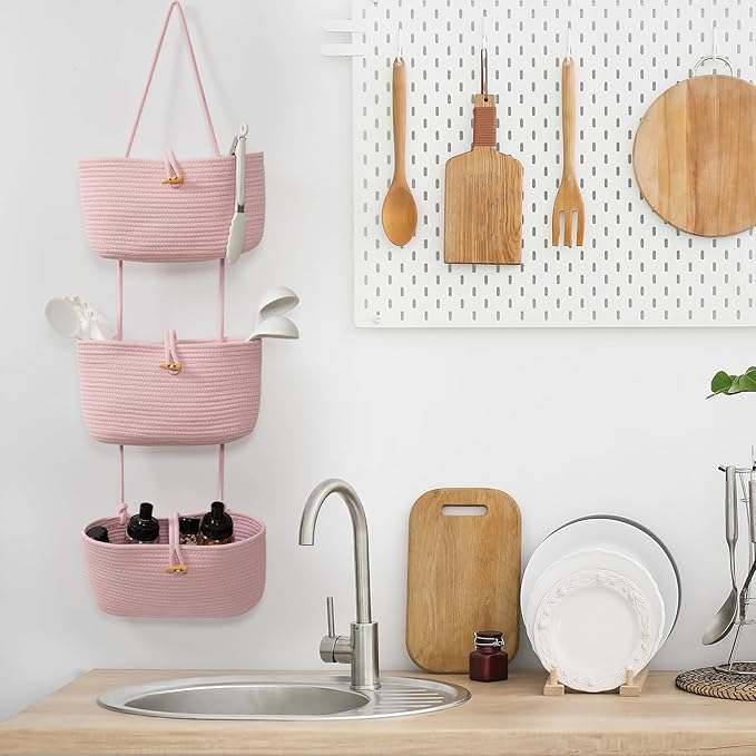 TeoKJ Over the Door Hanging Baskets with Button Strap, 3-Tier Woven Cotton Storage Organizer Bag, Wall-Mounted with Hook Decorative Hanging Nursery Baskets - Pink